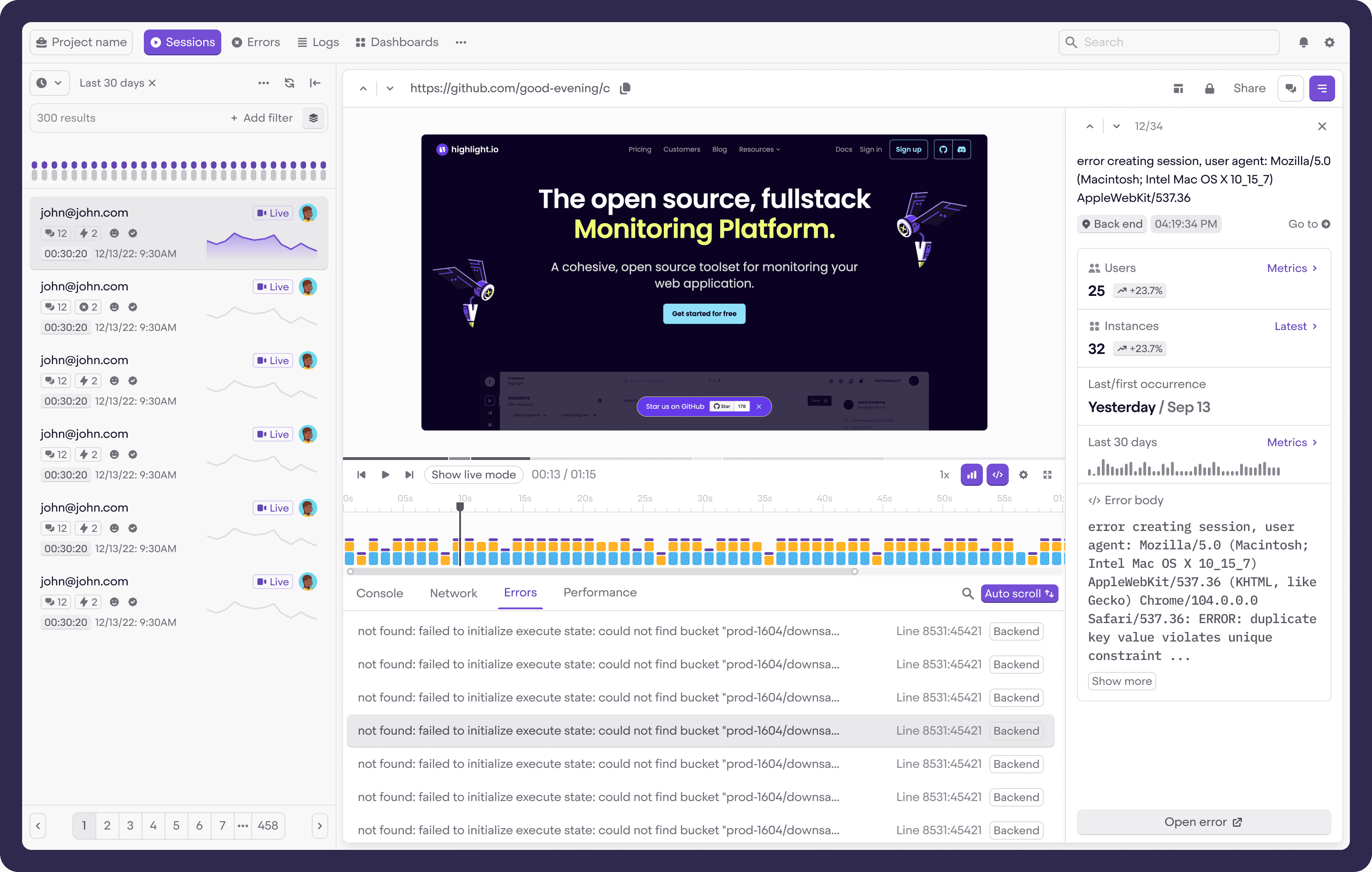 In order to make the most out of highlight.io, we suggest instrumenting your frontend and backend so that you can attribute frontend requests with backend errors and logs. See an example below, where you can view an error's details alongside frontend session replay, allowing you to get the full context you need.