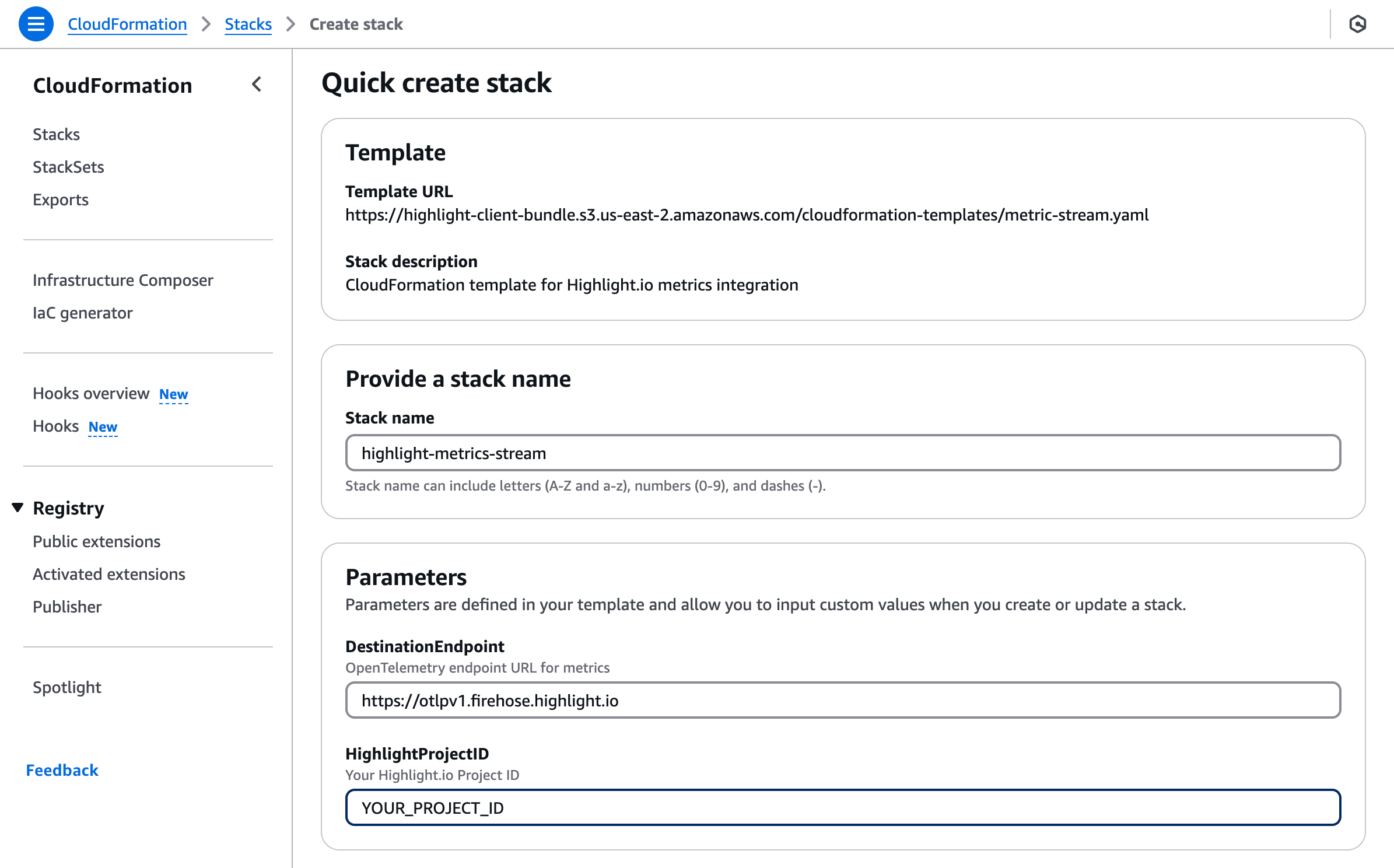 Configure your Firehose stream to ship metrics to our OpenTelemetry 1.0 Firehose metrics format ingest endpoint https://otlpv1.firehose.highlight.io, enabling GZIP content encoding and passing paramater x-highlight-project with your highlight project ID.