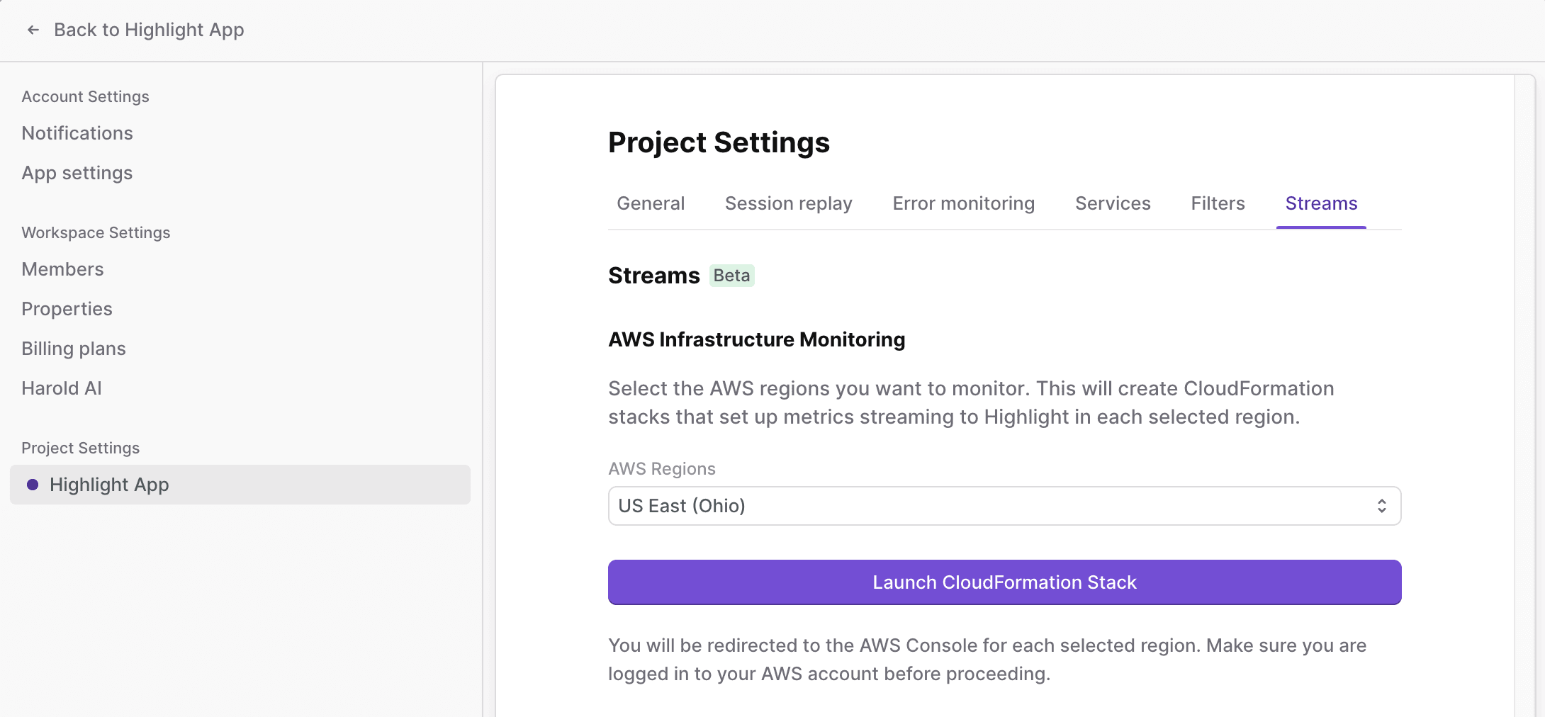 Highlight makes it simple to monitor your AWS infrastructure metrics. You can easily set up monitoring for services like EC2, Lambda, RDS, and more with just a few clicks using our CloudFormation template.